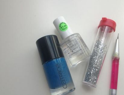 Als eerste lak je je nagels in een basecoat en een basiskleur (ik heb Blue Caro Ciao van Catrice gebruikt). Dit laat je goed drogen. Dan pak je een papiertje waar een paar grote glitter op uitstrooit, ook doe je een beetje topcoat op het blaadje. Met een dottingtool zet je stippen van topcoat op je nagel. Daarna pak je met je dottingtool de glitter flakes op en plaats je je op de topcoat op je nagel. Dit doe je bij al je nagels.