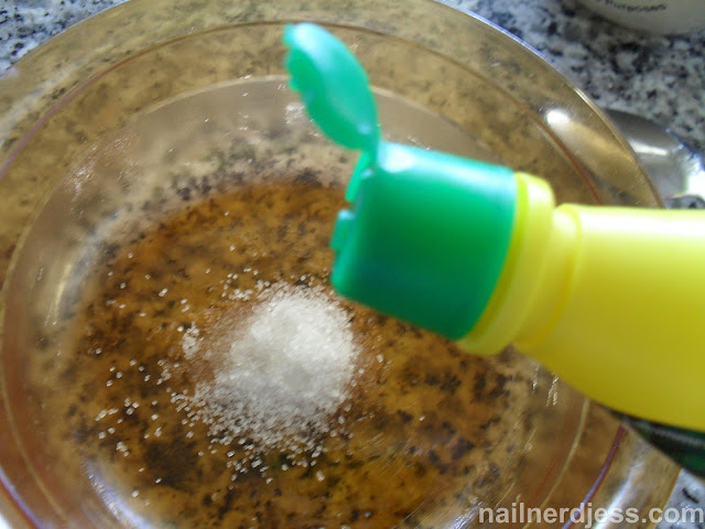 Doe ander halve theelepel in het bakje en doe daar wat druppeltjes citroensap bij.