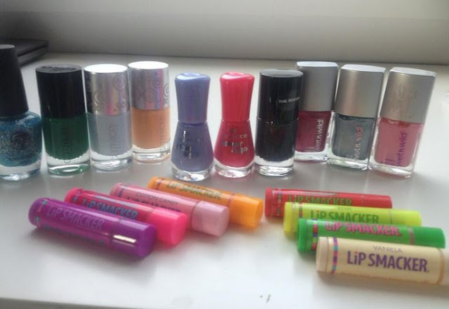 In de maand april ben ik weer eens flink los gegaan in het kruidvat, met de 1 + 1 actie, op de rommelmarkt en in de op=op winkel. Ik heb heel erg veel nagellak gekocht, zoals je boven kunt zien. Ook heb ik wat lip smackers gekocht.