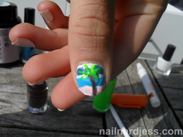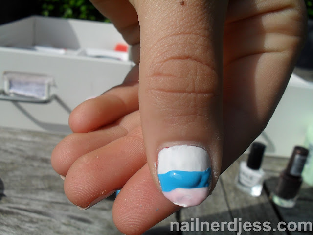(Sorry voor de wazige foto!) Lak een klein stukje onder op je nagel licht roze. Dit wordt zand. Helaas had ik zelf geen zand kleurige lak.