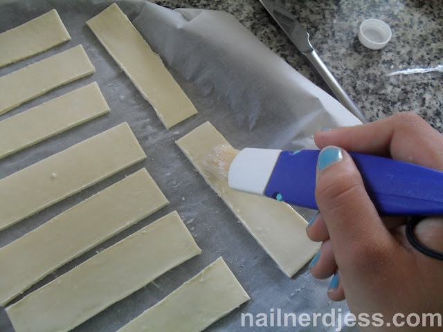 Smeer nu met een kwast melk of water over het bladerdeeg heen. Als je geen kwast hebt kan je het ook met een keukenrol papiertje doen en dan op het bladerdeeg deppen.