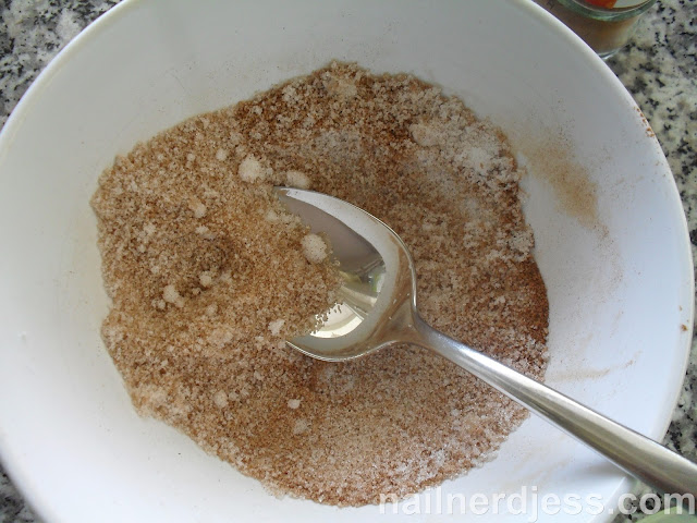 Je begint met het mengen van suiker en kaneel. Doe 4 eetlepels in het kommetje, zorg dat alle klonten er uit zijn. Zoals je kunt zien op de foto is dat bij mij niet helemaal, maar die heb ik er later nog uit gehaald.