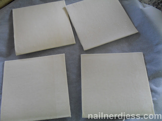 Snijd het bladerdeeg in stukjes. Ik heb per 1 bladerdeeg 4 stukken gesneden en ik heb 3 bladerdegen gebruikt. Als je wilt kan je er uiteraard ook meer maken, maar bij mij paste het niet in de oven.