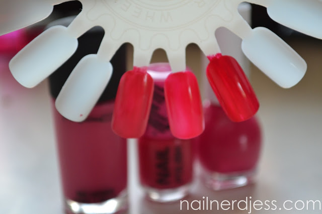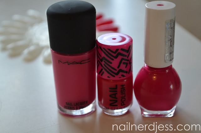 Ik koos voor de 3 lakken. De links is mac in de kleur steamy. De tweede is van de H&M kleur pink. De rechtse is van miss sporty in de kleur, ofja nummer 502. Aan de buitenkant lijken ze helemaal op elkaar. Misschien zie je dat niet helemaal perfect op de foto.