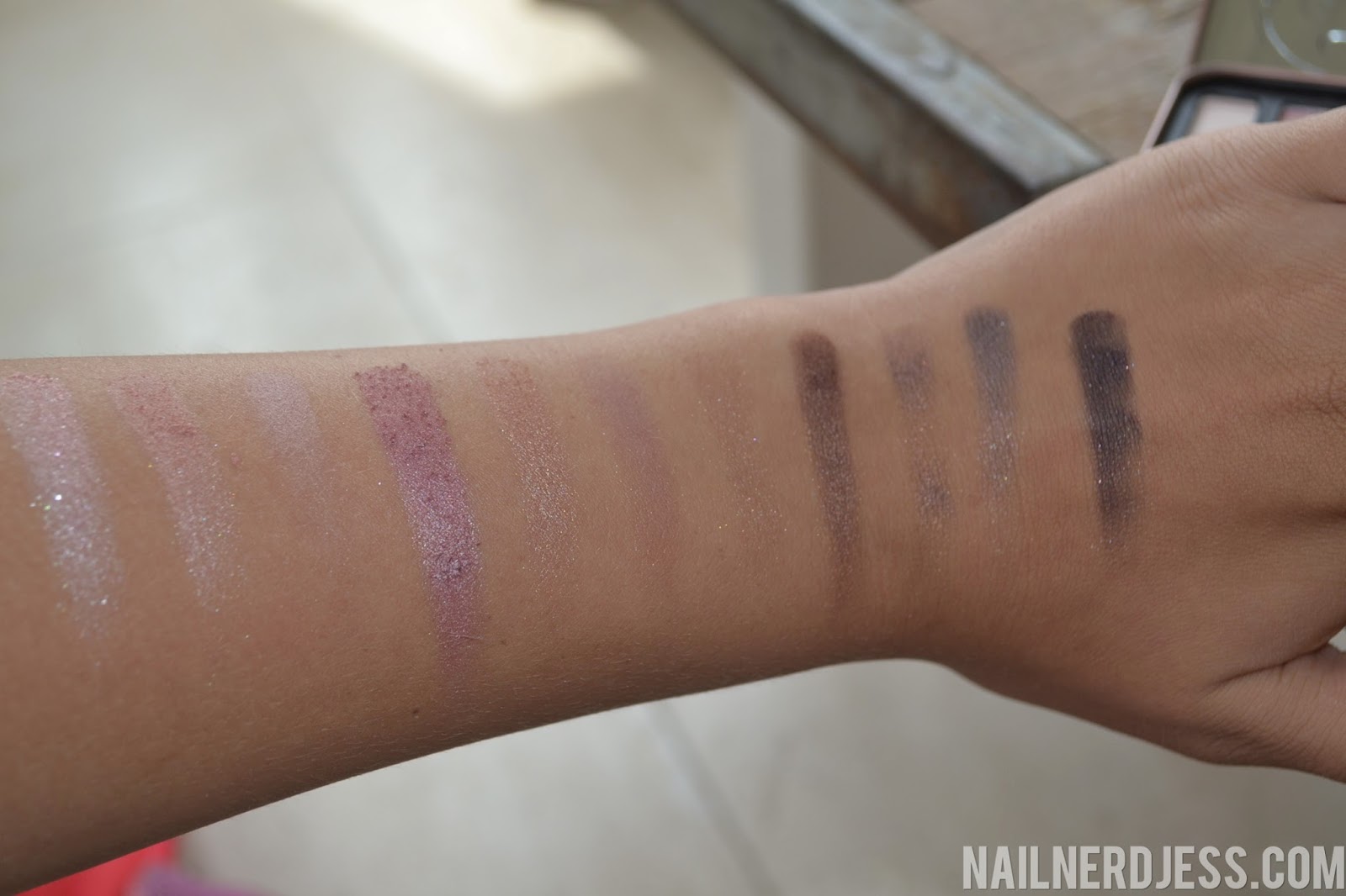 De swatches op mijn arm zien er goed uit. Ik merkte dat ze wat minder fall-out zullen hebben.