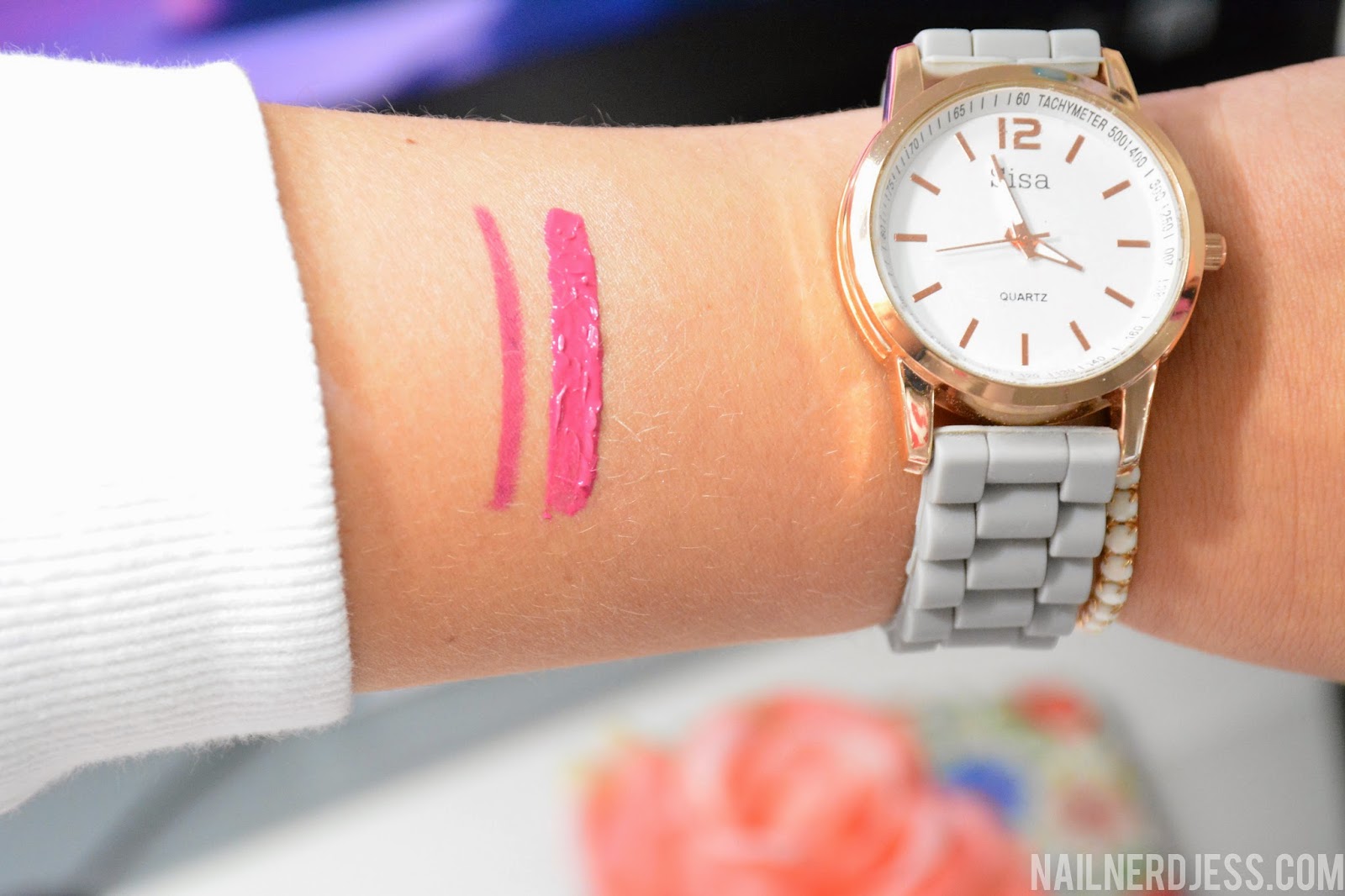 Dit is de swatch van de producten. Links zie je de Essence lipliner en rechts de lipgloss van de Primark.