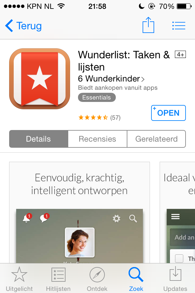 Dit is de app. De app (of programma, ik noem het in dit artikel even app) heet wunderlist en is te downloaden op je telefoon (als het goed is op iedere telefoon) en je laptop of pc. Trouwens, ook op tablet!