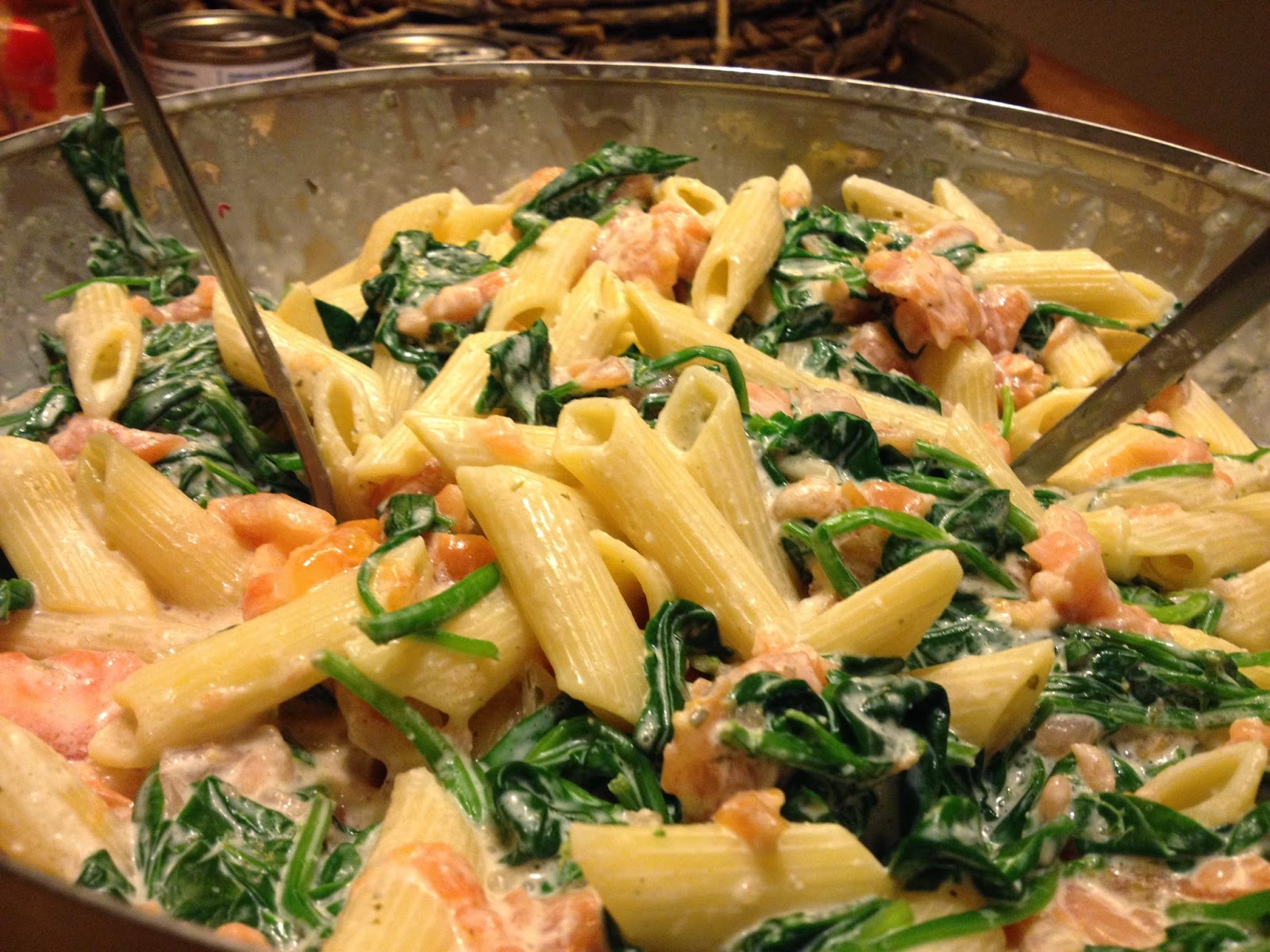Dit is zooooo lekker! Penne met zalm, spinazie, ongevelde tomaten en kruidenboter. Heeeeeeeeeerlijk!