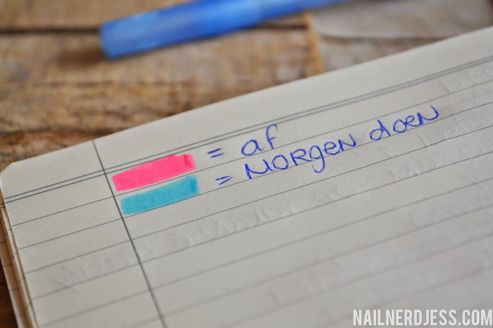 Ik gebruik dus twee boekjes, twee markeer stiften en een pen.